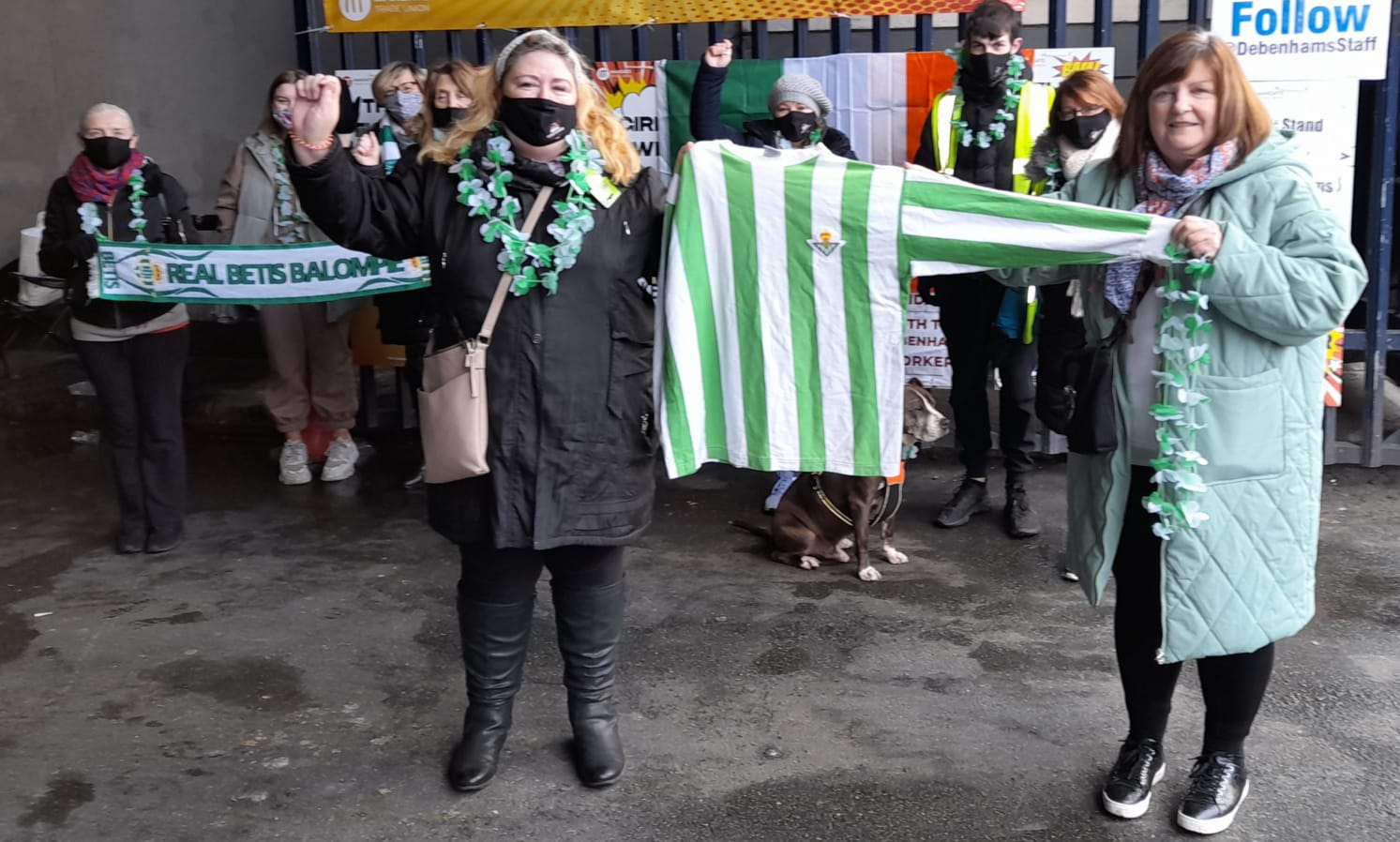 Since the workers, mainly women, have been on 24-hr pickets, their daily norm has changed from selling clothes to stopping trucks taking the stock from stores. In the corner of the loading bay ‘Strongbow,’ the dog is wrapped in a green and white-collar, Iain Campbell from the Real Betis supporters club Dublin drops off a scarf, while Jane rustles through her bag for the green and white jersey. In an era of billionaire owners, it’s the ordinary football fans where the workers have found support; some has come from Spain.