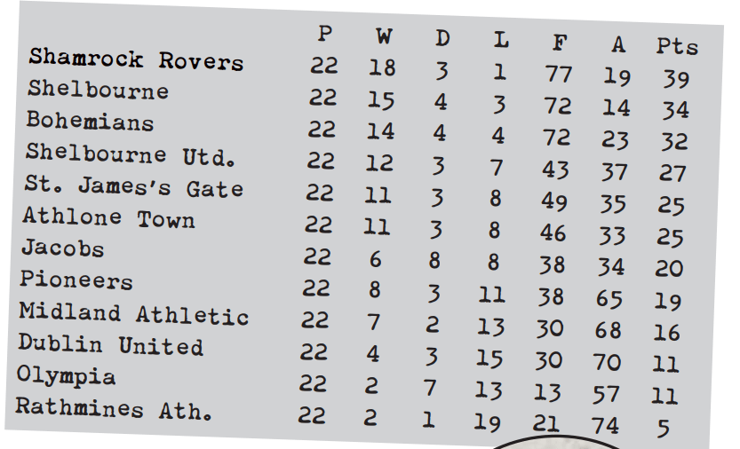 At the other end of the table, it was a three-way fight for supremacy between Bohemians, Shelbourne and newcomers Shamrock Rovers. While Bohs were table toppers at the halfway point, and ran up some spectacular scorelines, including a 7-0 win over Pioneers and an 8-0 drubbing of Olympia, costly defeats to the likes of Shelbourne and Midland Athletic at crucial points in the season meant Bohs had to settle for 3rd place.