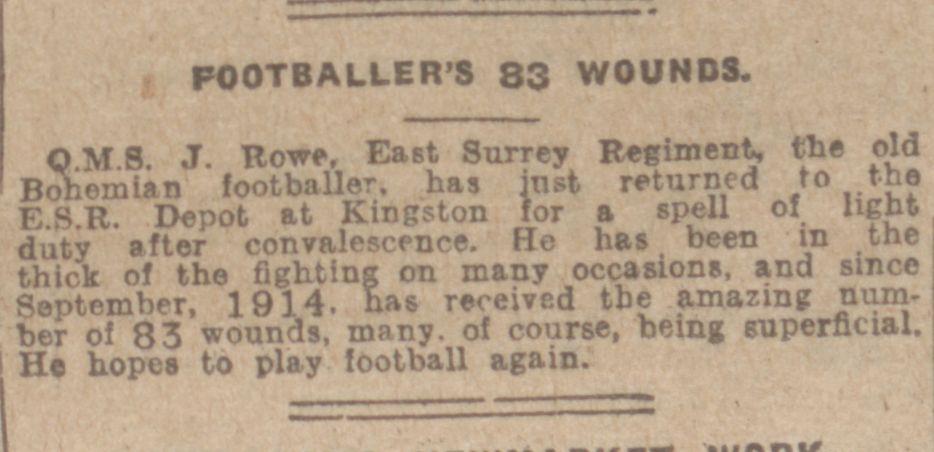This was not to be Joss Rowe’s last connection with Manchester United however, the English club would recruit the Bohemian solider to their starting XI on 5th March 1914, with Rowe, appearing under an assumed name as “Howe” featuring as a full-back in United’s 4-2 defeat to Preston North End. Despite the result the match reports were universal in their praise for the mysterious new United full-back and he was expected to retain his place in the side for United’s next match against Aston Villa. Some reports went so far as to say “Sergeant Rowe, East Surreys and Bohemians… is quite on the cards that a new right full has been unearthed for England for her closing internationals. We can also mention that Rowe is equally at home at left full, or in any position in the middle line”. Despite playing under an assumed name against Preston, Rowe was spotted by a soldier of his acquaintance and his true identity quickly became known by the pressmen in Britain and Ireland and his performance was widely remarked upon. Even that talk of an international call-up!