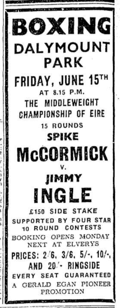 While Doyle’s career might have come to an end in Dalymount others were only approaching their zenith. The Dublin sporting public became enthralled by the developing sporting rivalry between John “Spike” McCormack and Jimmy Ingle. Both fighters were familiar to each other from the amateur ranks. Ingle had gone on to win gold at the European Amateur Championships which were held in Dublin in 1939 while Spike had enlisted in the British Army early in the War. After being invalided out Spike went pro in 1942, as did Ingle. Spike making his Dalymount debut a year later. In 1944 both fighters would face off in Dalymount Park for their first meeting as professionals and would renew a long-standing sporting rivalry from their amateur days. Spike would win that fiercely contested bout on points but the great spectacle created a demand to see the pair in action again.